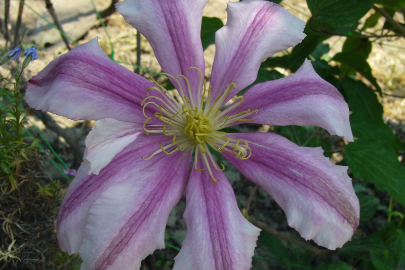 Цветки чашеобразно раскрытые 14-16см в диаметре.Чашелистиков 6, обратнояйцевидные, отделены друг от друга малиново-розовые с яркой красно-пурпурной полосой по центру , в жару бледнеют. Пыльники желтые светлеют.