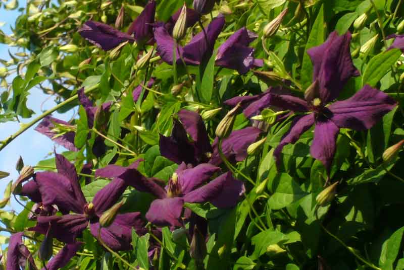 Кустарниковая лиана с побегами длиной 3—4 м с хорошо развитой корневой системой. Листья перисто-сложные, состоят из 3—5 крупных листочков. Цветки раскрытые, собраны по 3, не крупные, 8—10 см в диаметре, направлены вверх, при отцветании могут поникать. Околоцветник простой, состоит из 4-5 окрашенных чашелистиков, сине-фиолетово-черный, бархатистые, без запаха. Бутоны удлиненной формы и направлены вверх.