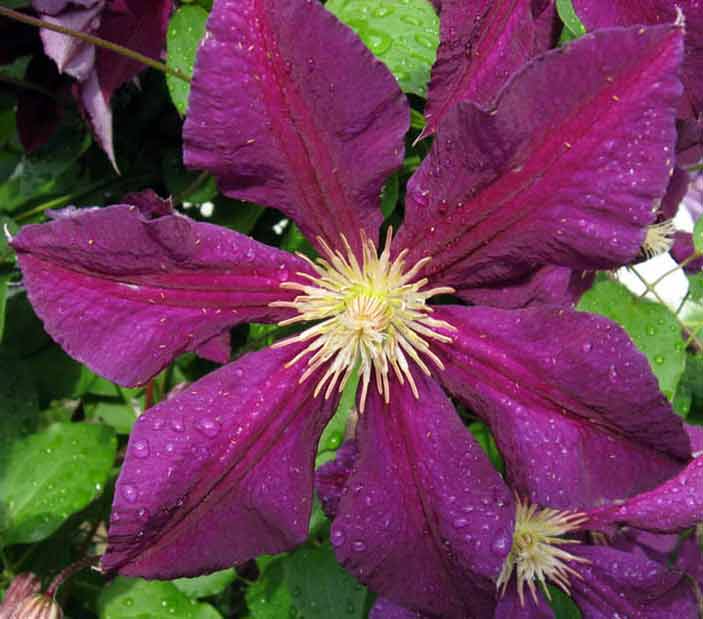 Цветки раскрытые , 9-12см в диаметре.Чашелистиков 4-5, темно-пурпурные , загнуты наружу.Пыльники светло-желтые.
