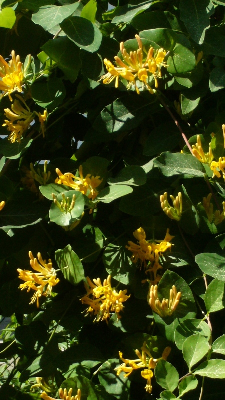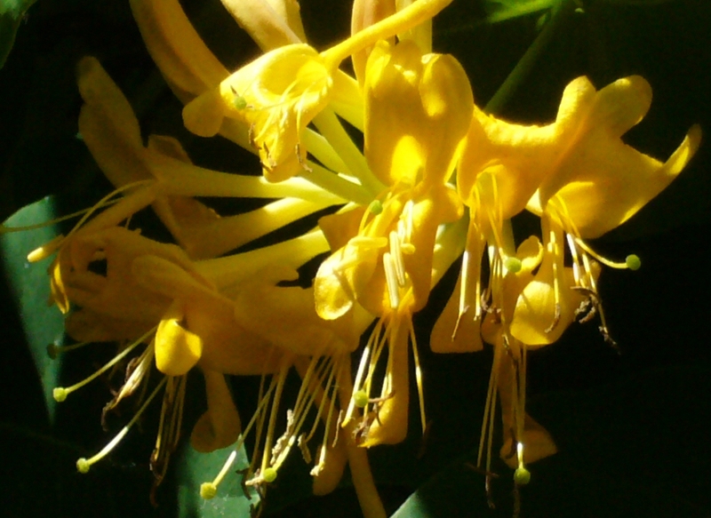 Цветки с медно-жёлтыми снаружи и светло-желтые внутри, ароматные, собраны в мутовки в пазухах верхних сросшихся листьев. Венчик 5-6 см длиной, двугубый. Цветки душистые, аромат их усиливается к вечеру.