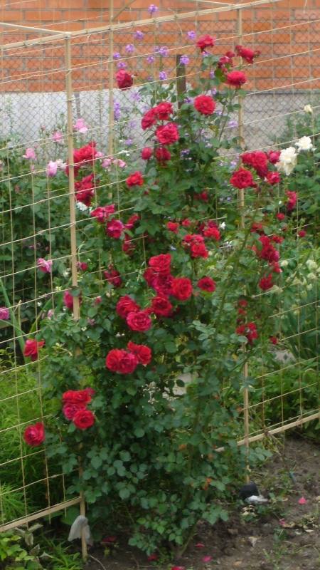 Цвет: бархатисто-красные цветки в диаметре 10-13см Высота куста -1.1-2м, ствол жёсткий. Обрезка: легкая. В северных широтах требует легкого укрытия на зиму. Пригоден для вертикального озеленения в виде веера .