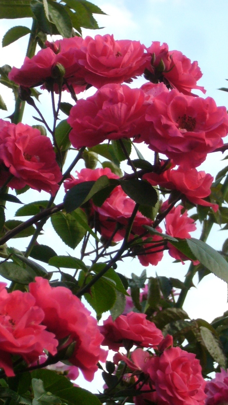 Цветы красные-розовые, яркие, стойкие, крупные 7-9 см, махровые , слабо душистые, в соцветиях по 3-6шт