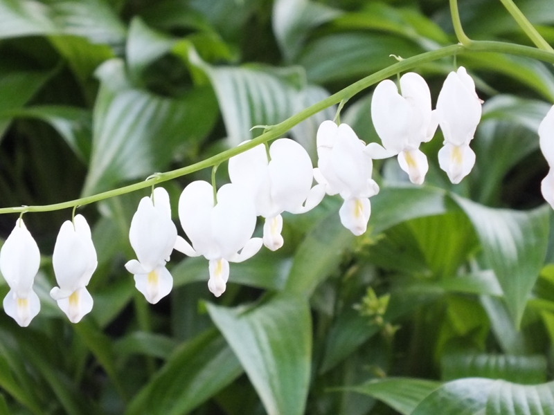 Многолетник, образующий массу глубоко разрезных , тускло-зеленых листьев, над которыми летом поднимаются изогнутые цветоносы с висячими сердцевидными, белыми цветками.