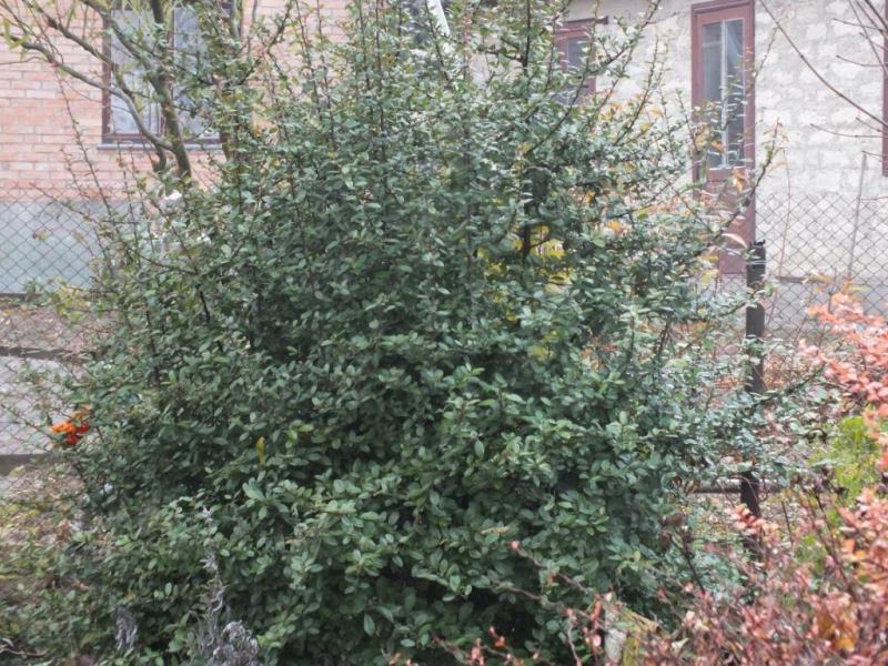 Вечнозеленый , колючий кустарник, с возрастом приобретающий сводчатую крону.Листья крупные, овальные, глянцевые, темно-зеленые.В начале лета распускаются белые цветки, а осенью созревают гроздья мелких оранжевых ягод. Высота 6м, диаметр 5,5м Хорошо подлежит к стрижке в огражения высокие, а также к фигурной стрижке.