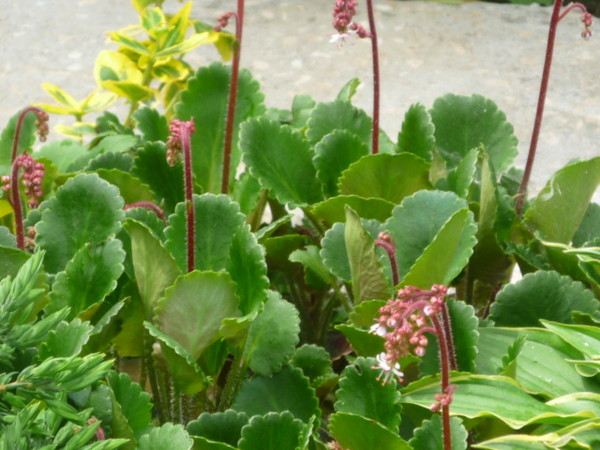 Вечно зеленый ковер высотой 5-6см .Лист широкий, сочный, зеленый, вечнозеленый. Соцветия высотой 12-15см, белый в середине розовые, звездовидные, в метелках.