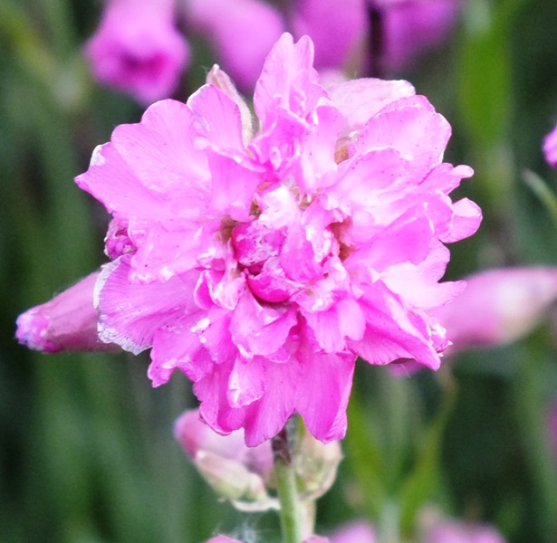 Растение многолетнее, травянистое. Стебли простые, 40см высотой, вверху клейкие. Цветки малиновые махровые. Цветение с конца мая.