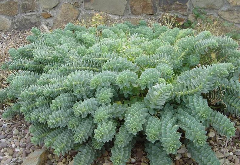 Вечнозеленое многолетнее, голубовато-сизое растение с стелющимися, густо об лиственными стеблями . Листья ромбические,с налетом серебристым. Соцветие зонтичное с лимонно-зеленым цветом на концах стебель. Высота 20см, диаметр 30-50см. Открытая корневая система - куст.