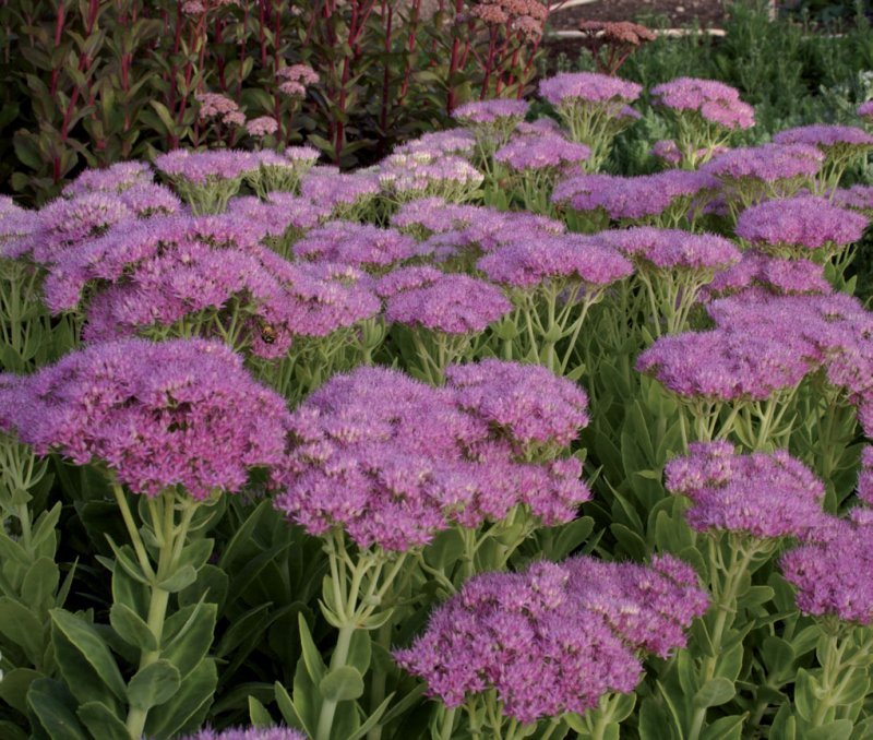 Прямостоячие стебли, листья сидячие, крупные, лопаточные, салатово-зеленые,цветок полузонтики светло-розовый.