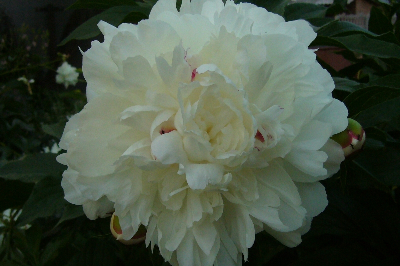 Многолетнее травянистое растение.Цветок махровый, плотный. Чисто-белый, в центре на кончиках лепестков метки красного. Запах слабый, приятный. Стебли прочные.Диаметр цветка 15-18см, высота куста 60-70см. среднего цветения.