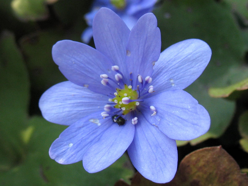 Листья трех-пяти лопастные, опушенные, цветки крупные небесно-синего, простой .