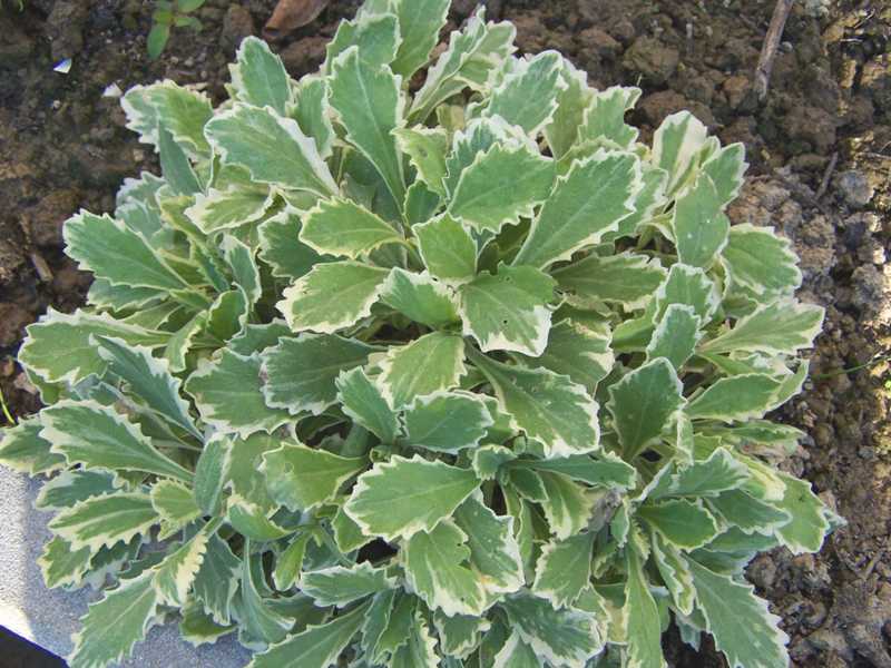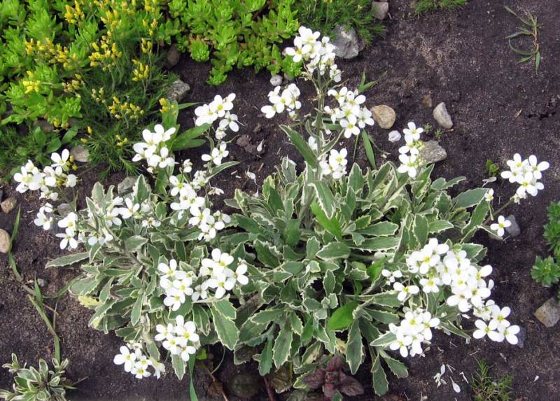 Вечнозеленый ковровый многолетник с розетками овальных зеленых листьев с кремовым краями. Весной и летом образует кисти белых цветков простой формы.