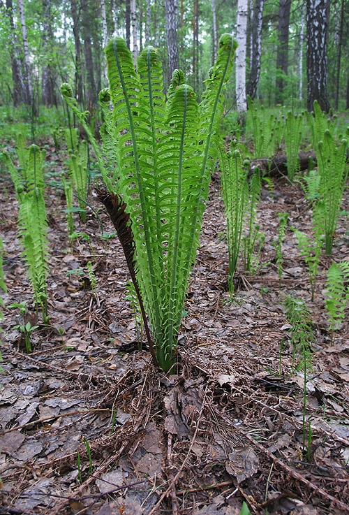 Листопадный папоротник.Ланцетные, прямостоячие листья расположены в виде воронки. В центре ее в окружении ярко-зеленых неспороносных листьев расположены плотные , темно-коричневые спороносные листья. высота до 1 м, диаметр до 50см.