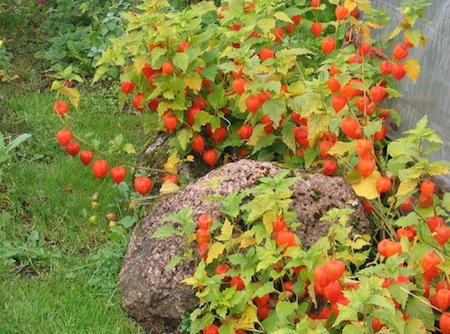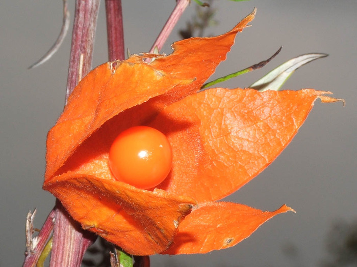 Листья овальные, у основания расширенные,чашечки с плодами внутри.