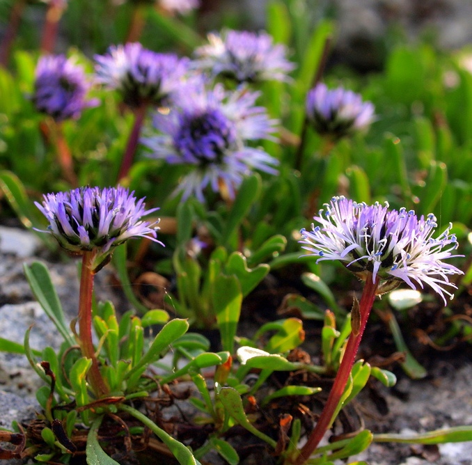Многолетнее побего- укореняющиеся растение , высотой 10-см, соцветия шаровидное, пушистое, голубовато-сиреневое, одиночное, 1 см в диаметре. Цветет в июне.