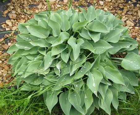 Лист складчатый, сердцевидный, с острым кончиком.Листья голубовато-зеленая, матовая сверху и с сизым налетом снизу, в возрасте с небольшими выемками, край ровный.Цвет -лавандовый, Высота - 38см карлик, с цветком, лавандовым.