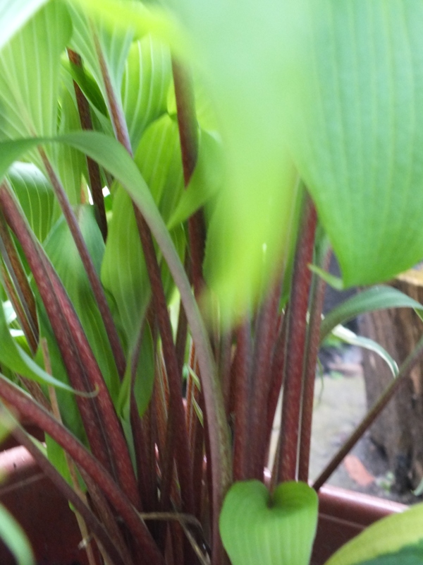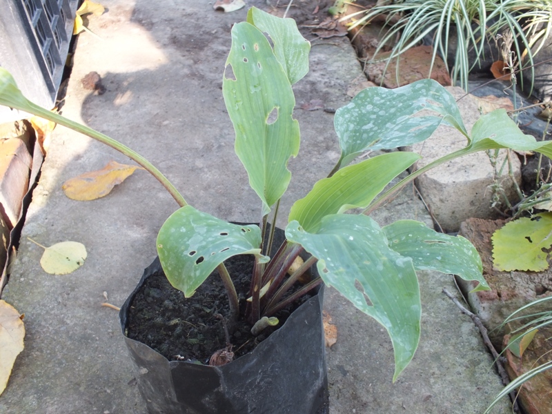 Темные зеленые блестящие листья темно-зеленые и бордового переходящие стебли. Цвет поднимается на листочек, Цветет розовым. полукарлик