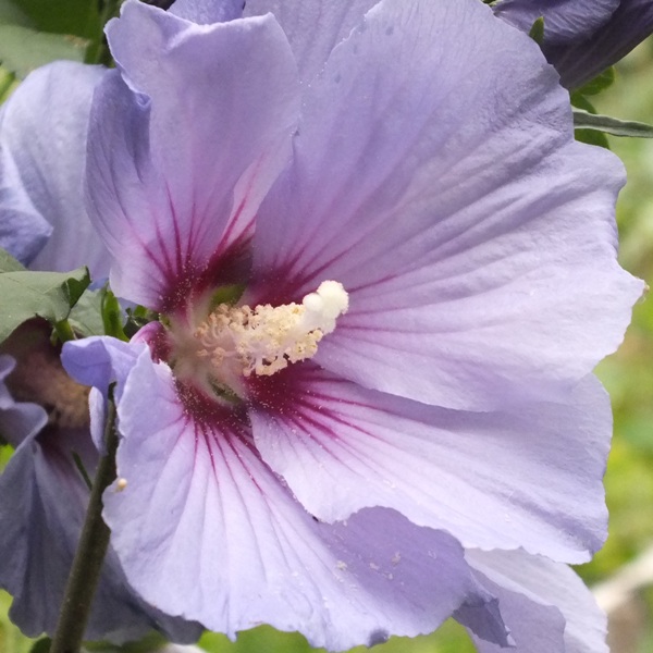 Листопадный кустарник высотой до2м, лист ярко-зеленый яйцевидный . Цветки одиночные, окрас голубой, простой.