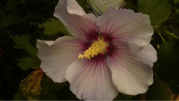 Листопадный кустарник высотой до2м, лист ярко-зеленый яйцевидный . Цветки одиночные, окрас белый с красным глазком, простой.