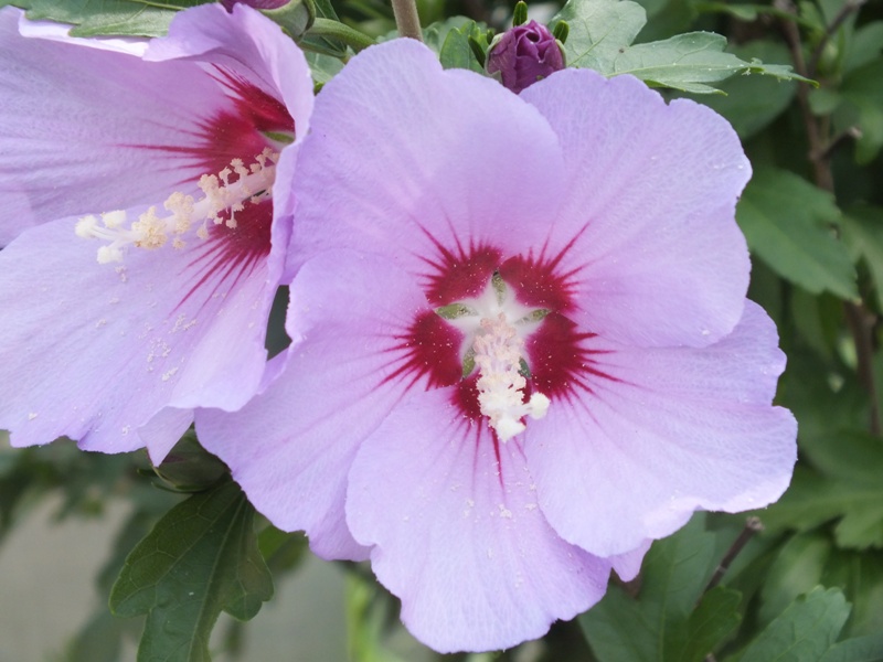 Листопадный кустарник высотой до 1,5 м, лист ярко-зеленый яйцевидный . Цветки одиночные, окрас фиолетовый, простой.