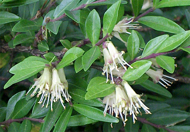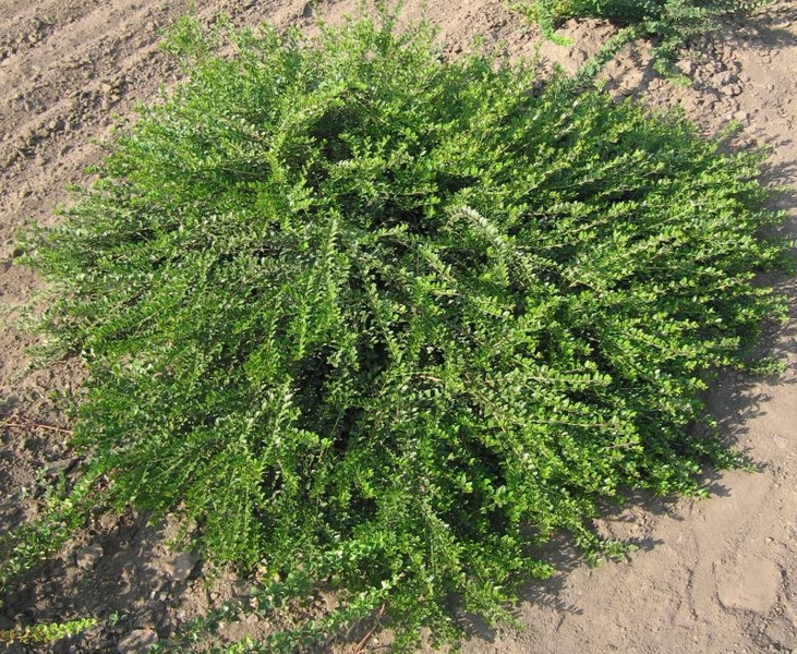 Вечнозеленый кустарник , листья темно зеленые до 6мм.Стебли многослойные один поверх другого, делая вид, стоге сена. Цветы сливово-белые , душистые появляются в конце весны, в серидене лета плоды фиолетового цвета до 6мм, несъедобные. Высота и диаметр до 1,5м.