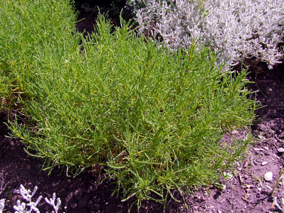 Вечнозеленый, густой кустарник с ароматными , перистыми, серо-зелеными листьями, украшенный в середине лета светло- желтыми соцветиями- корзинками. Высота , диаметр- 50-60см.