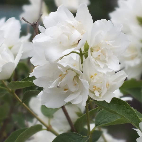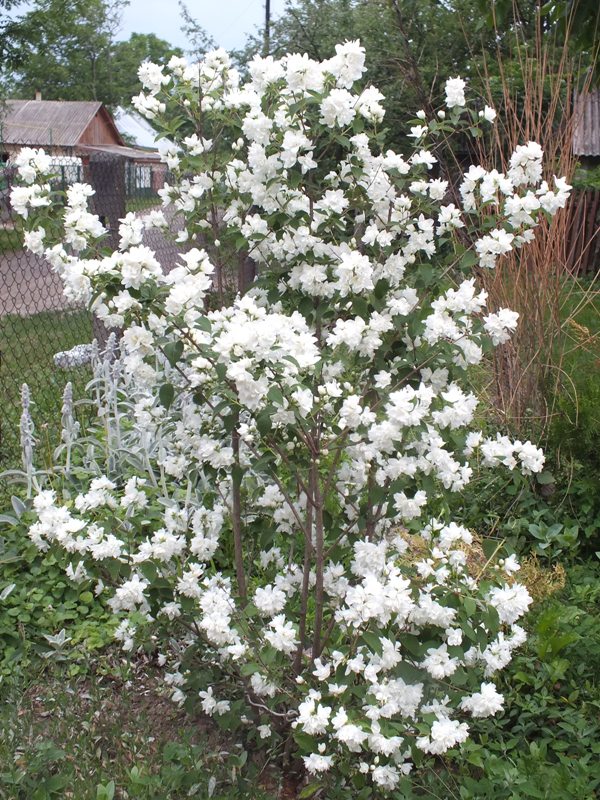 Листопадный кустарник с компактной кроной и темной , отслаивающейся корой. Темно- зеленая листва оттеняет крупные цветки , густо махровые, белые цветки, в массе распускаются в начале лета. Высота , диаметр до 3м.