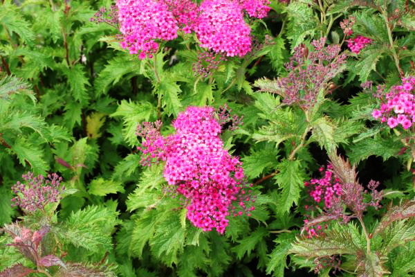 Многолетний листопадный кустарник, высота куста 40 – 50 см. Лист ярко-зелёный, закрученный с резным краем. Цветки ярко-малиновые.