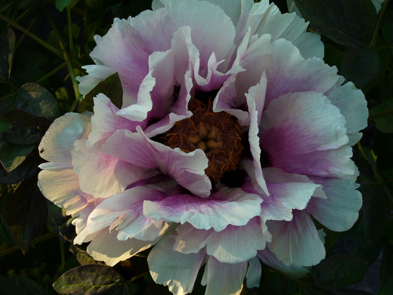 Листопадный кустарник высотой 1.5-2м с округлой плотной кроной. Листья крупные, перистые.Цветки одиночные на концах цветок грязно-сиреневый переходит на светлый тон, до 30-40см в диаметре. Цветет в середине мая.