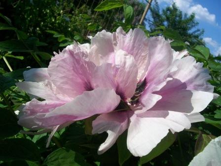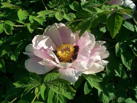 Листопадный кустарник высотой 1.5-2м с округлой плотной кроной. Листья крупные, перистые.Цветки одиночные на концах цветок нежно-розового цвета, до 30-40см в диаметре. Цветет в середине мая.