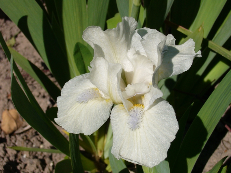 Волнистый белого цвета с сиреневыми бородками, переходящий со светло-желтого , h-20-25, цветок крупный.