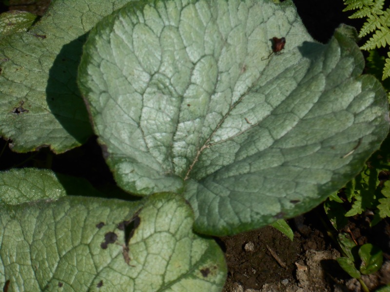 Многолетник с сердцевидными листьями, белый на крап по листу, почти белые с серебряным налетом. Весной несет кисти мелких ярко- голубых цветков.