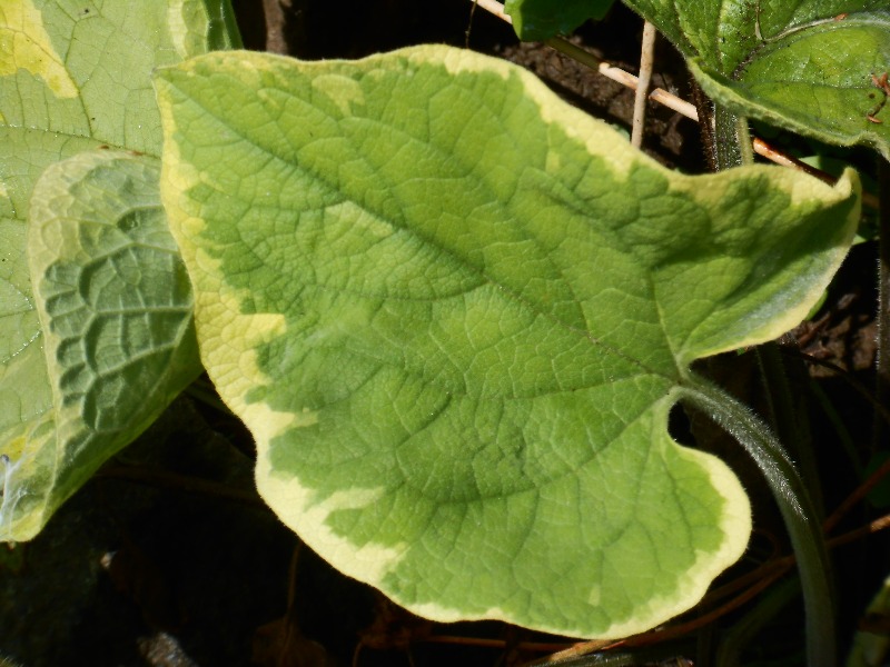 Многолетник с сердцевидными листьями, с кремово-белой полосой по краям. Весной несет кисти мелких ярко- голубых цветков.