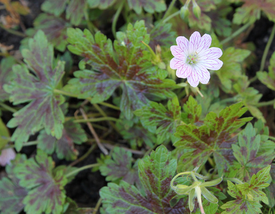 Многолетник , темно-зеленая листва с светло-пурпурным центром. Светлорозовые цветы на коротких цветоносах.