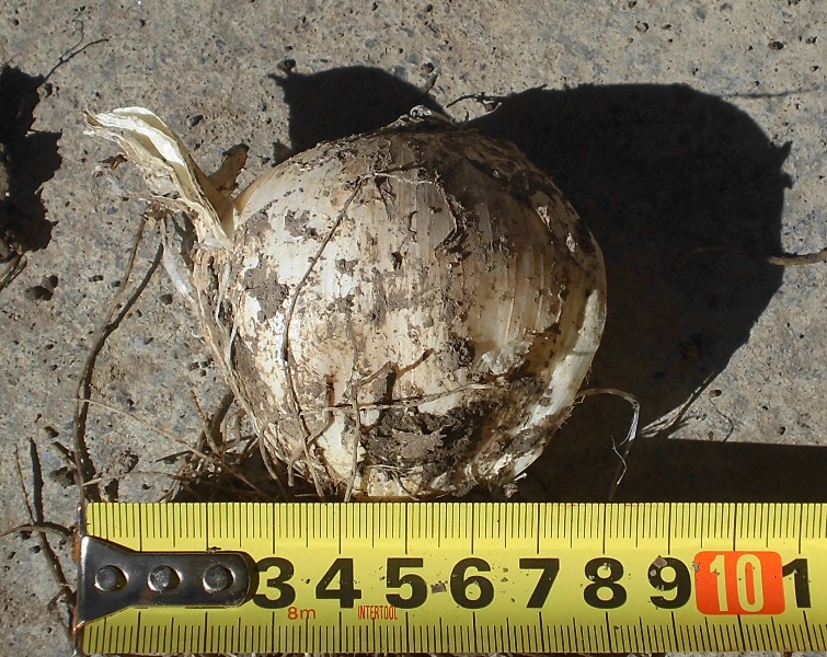 Луковичное растение. Цветонос тонкий, ребристый, высотой до 2м, цветки собраны в шаровидное , плотное соцветие , темно лилово - розового цвета. 15см. луковица