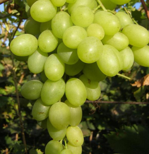 Грозди крупные, 600-1100 г, удлиненно-конической формы, средней плотности. Ягоды очень крупные, овальные, белые. Мякоть мясистая, кожица плотная, вкус с легким мускатным ароматом. Отличается высокой урожайностью.