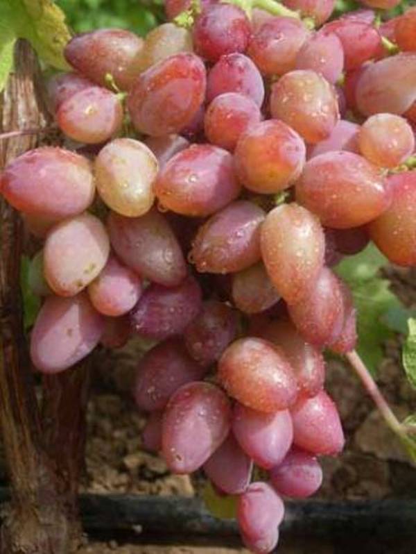 Грозди плотные и очень плотные, средняя масса грозди 680 г, ягоды овальные, несколько похожи на веретено, ярко желто-розовые, на солнце ярко-розовые. Мякоть мясистая, плотная, кожица практически не ощущается. Вкус гармоничный, с легким мускатом. Транспортабельность высокая.