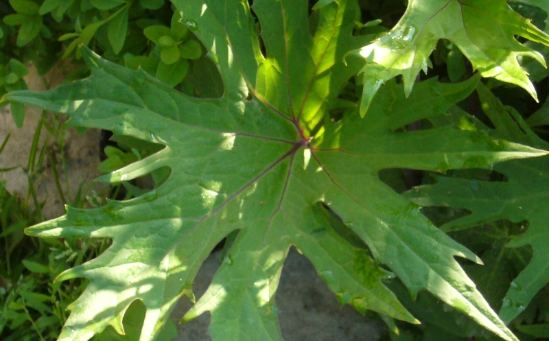 Травянистое растение h-150 см, прикорневые листья сильно разрезанные остропальчаты на тонких красно-коричневых черешках,