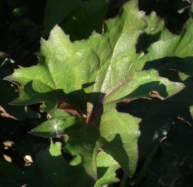 Травянистое растение h-60-80 см, прикорневые листья темно сиренево - коричневые гофрированные по краям,