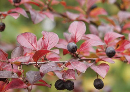 Прямостоящий, листопадный кустарник, до 2 м высотой, с густо опушенными молодыми побегами. Листья эллиптические заостренные, 5 см длиной, сверку блестящие, темно-зеленые, осенью пурпуровые. Розовые цветки собраны в рыхлые, щитовидные соцветия. Цветет в мае - июне .Плоды шаровидные, черные , блестящие, с коричнево-красной, безвкусной мякотью, сохраняются на кустах до глубокой осени. Плодоносит с 4 лет.