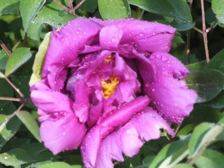 Листопадный кустарник высотой 1.5-2м с округлой плотной кроной. Листья крупные, перистые.Цветки одиночные на концах цветок насыщенно малинового цвета(темно- фиолетовый), до 30-40см в диаметре. Цветет в середине мая.