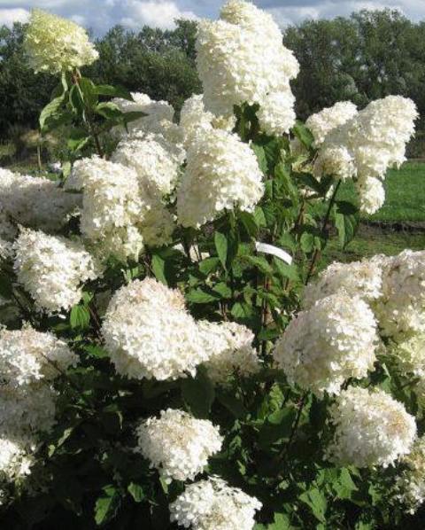 Кустарник высотой до 2-3м.Диаметром по верху до 2кв.м, по низу до 1.5 кв.м беред в возрасте от 20-40 лет. Листья в течение всего сезона зеленые, заостренные.Из всех метельчатых гортезий отличается огромными, наиболее крупными коническими соцветиями, вначале белыми с кремовым оттенком, окрашивающимися затем в розовые оттенки. Белые цветы с розовыми кончиками на концах ветвей цветут с середины лета до поздней осени.