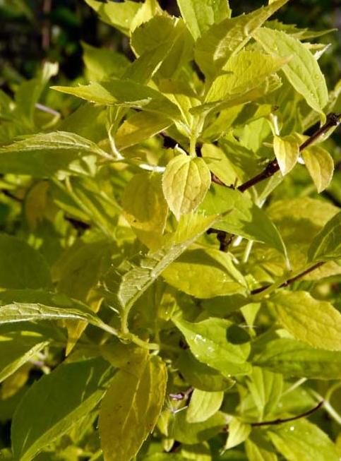 мГустой кустарник, с возрастом становится в ширину больше, чем в высоту. Цветы белые, некрупные, душистые. Листья весной и в первой половине лета лимонно-зеленые до почти желтых, после цветения - светло-зеленые, на молодых приростах более светлые.