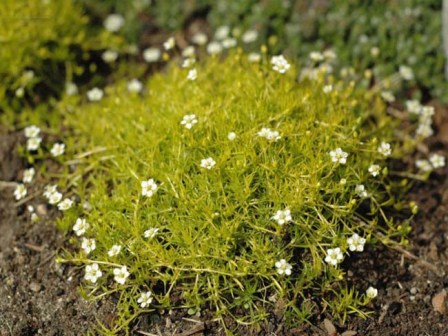 Многолетнее вечнозеленое растение, образующее густые желтые подушки , напоминающий мох, ползучий. Листья мелкие, цветки белые до 0,5см. Цветет обильно в июле до сентября.