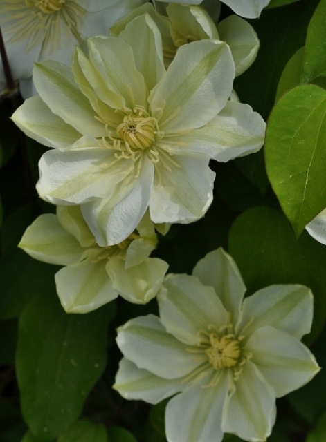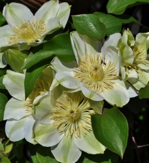 Ранний крупноцветковый клематис. Крупные (8-15см) светло-кремовые цветки, с тонкой зеленоватой полосой по середине лепестков. Желтые пыльники. На солнце выгорает.