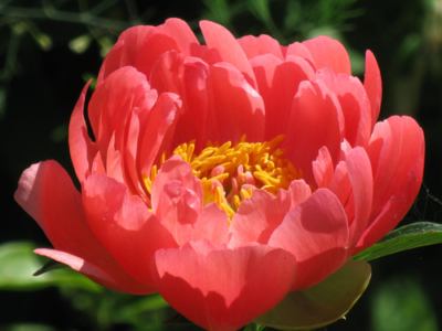 Высота 90 см. Цветок полумахровый. При роспуске розово-коралловый. Основания лепестков бело-зеленые. Лепестков много до 7 рядов. Со временем цветки выгорают до зеленовато-кремового. Диаметр цветка — 20 см. Стебли прочные. Хорошо стоит в срезке. Пион гибридный Coral Sunset предпочитает открытые и солнечные места, хотя допустимо небольшое затенение в полуденные часы.